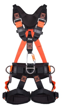 Nas costas possui um passador de fitas anatômico que se ajusta às escápulas, dispositivo indicador de queda e na região lombar possui uma fita auxiliar para resgate, conta com almofadas de conforto nas pernas, cintura e ombros;